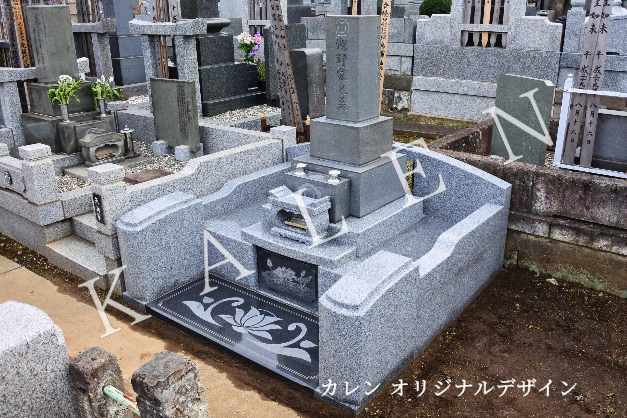 敷石とカロート前には黒色石材を組み合わせ、蓮のイラストを美しく彫刻。意匠性と実用性を両立しています。