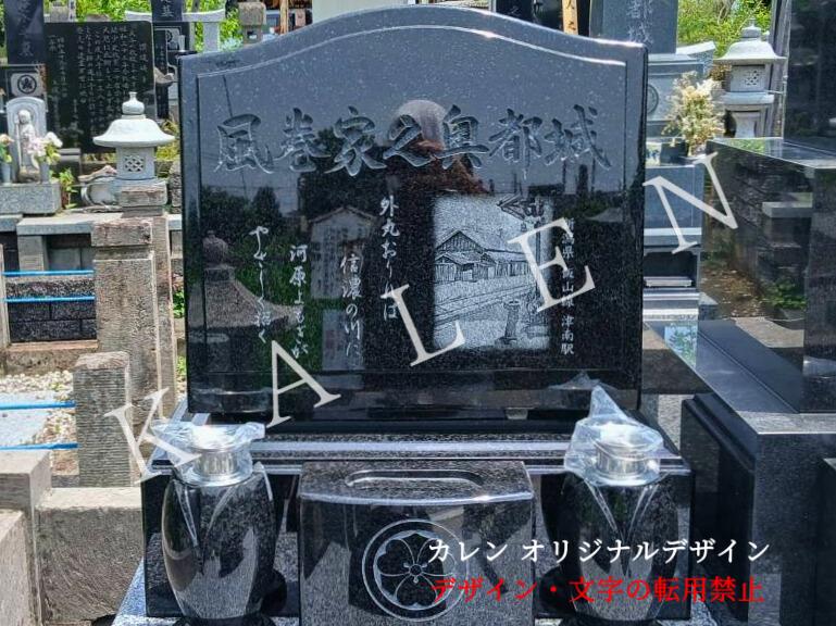 ふるさとの風景と歌が刻まれた洋型墓石(栃木県栃木市)
